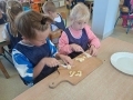 Dzieci z grupy Jeżyki samodzielnie przygotowały pyszną, kolorową sałatkę owocową oraz kompot. Przedszkolacy mieli soczyste minki na widok tak smakowitych owoców pełnych witamin. Każdy ochoczo zabrał się do pracy, ubrał fartuszek i umył ręce. Przedszkolacy pokazali, że potrafią bezpiecznie posługiwać się plastikowym nożem podczas krojenia owoców na małe kawałki. Było pysznie, kolorowo i zdrowo.